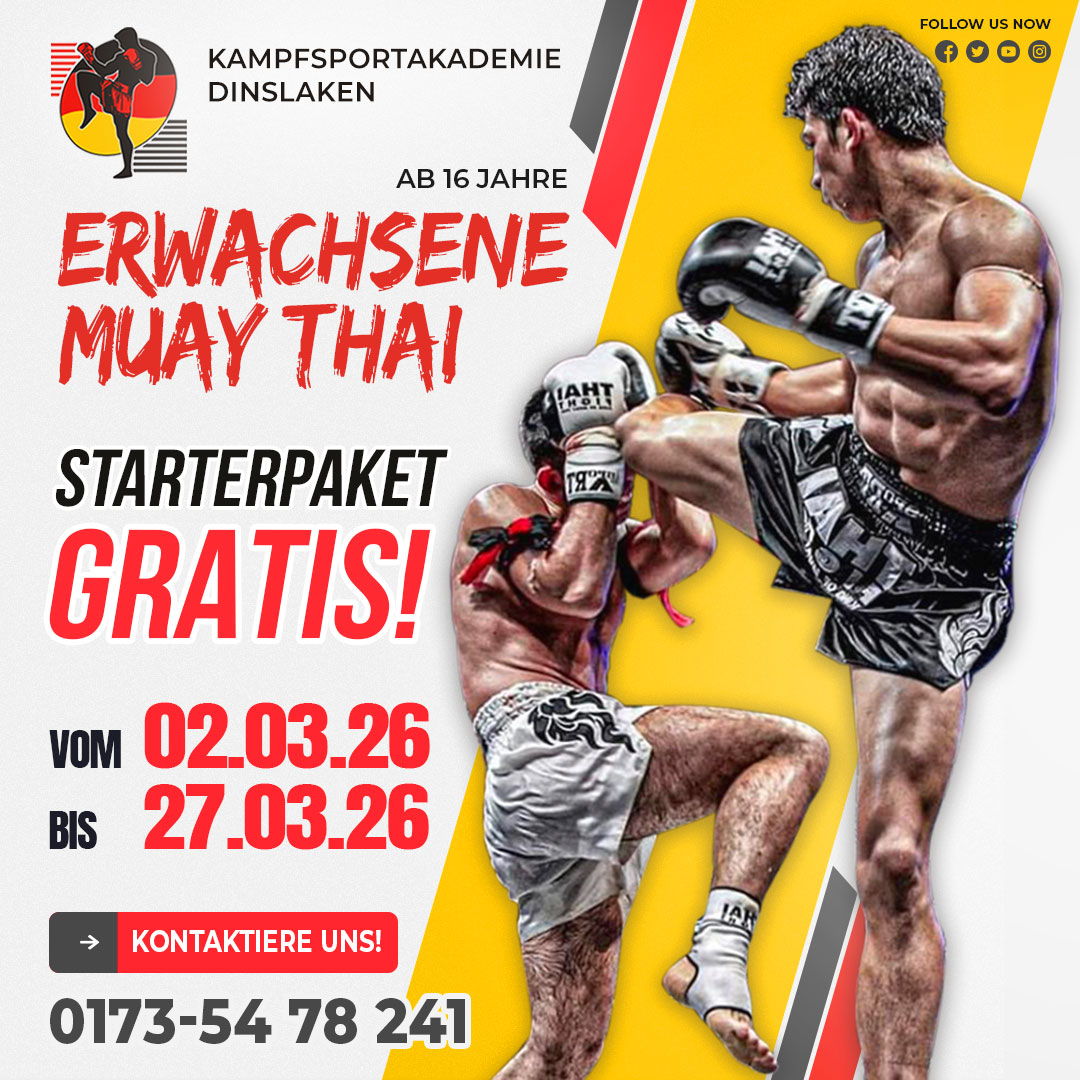 🔹 Muay Thai – Die „Kunst der acht Gliedmaßen“ aus Thailand. Mit Fäusten, Ellbogen, Knien und Tritten entwickelst Du beeindruckende Schlagkraft und lernst, Dich effektiv zu verteidigen.